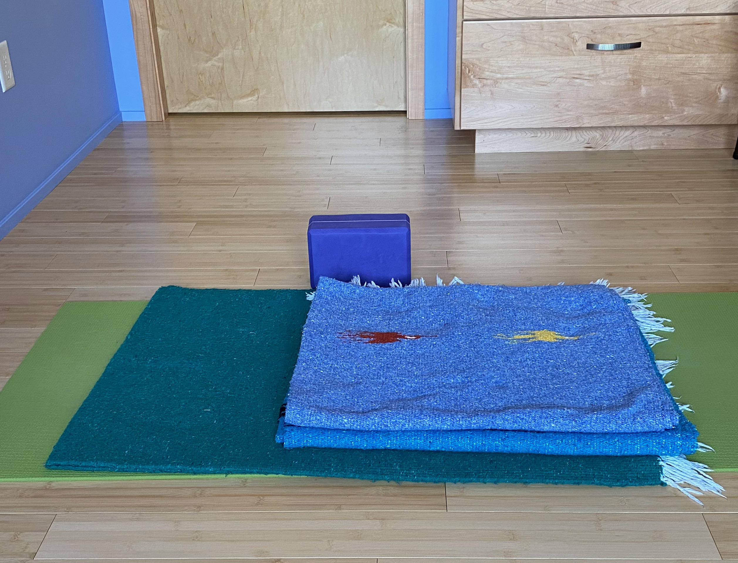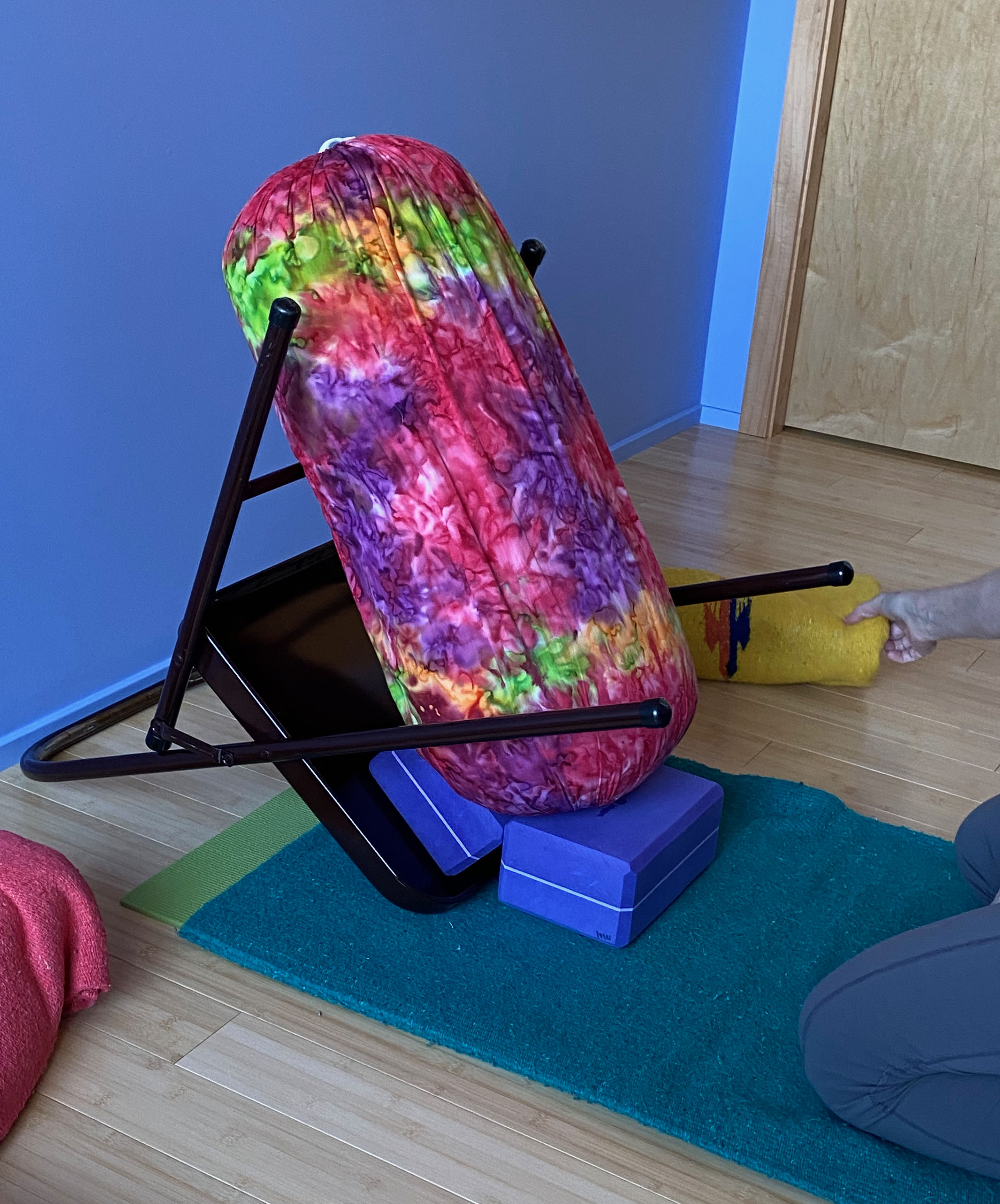 The blocks are used in three possible orientations, Papa Bear (tallest), Mama Bear (middle height), and Baby Bear (lowest). Place the higher one against the wall, and the lower one just a few inches away. When you lean the bolster up against the blocks, it will be just barely touching the higher block. Resist the temptation to take the bolster all the way on top of that block.
