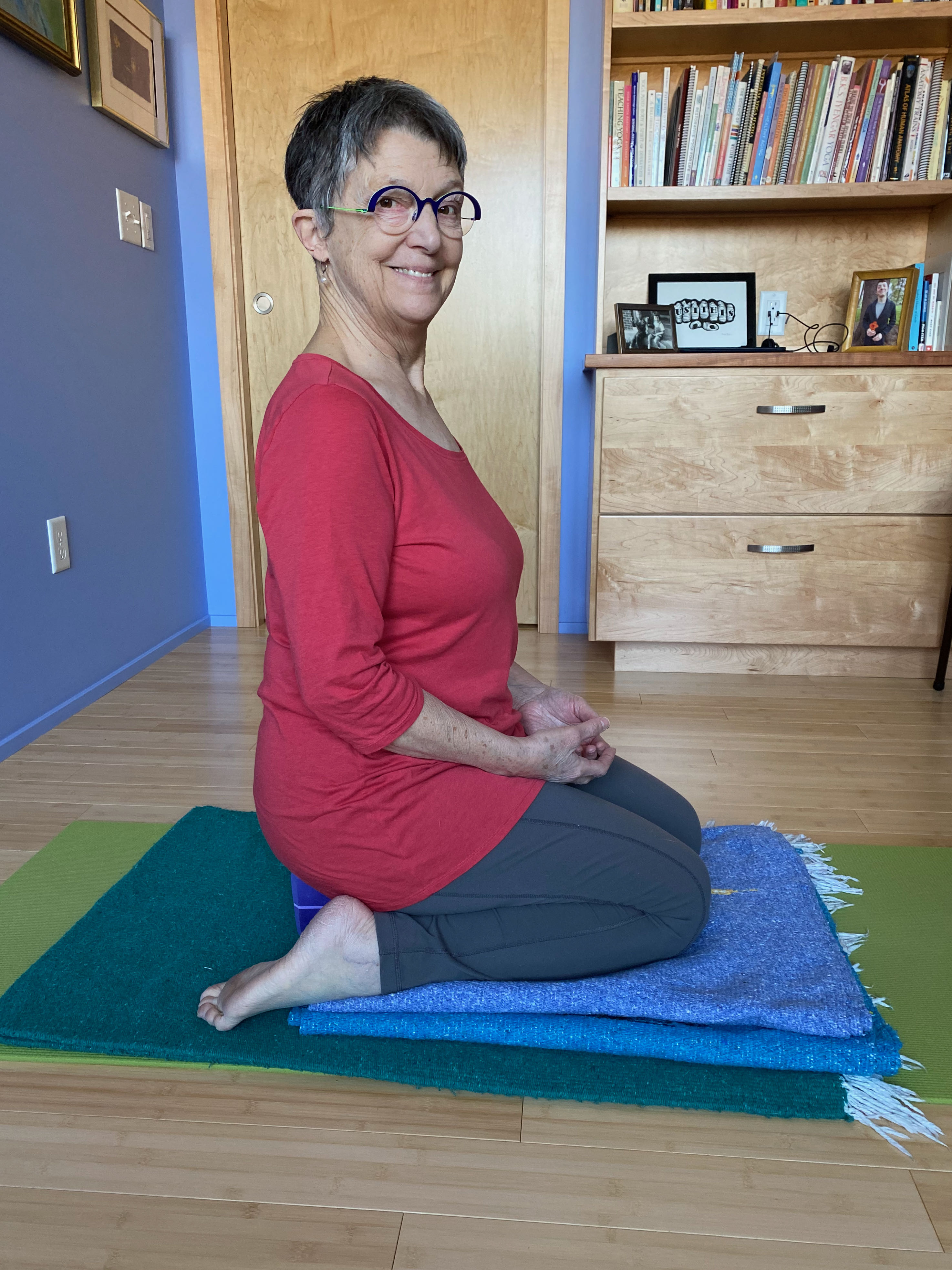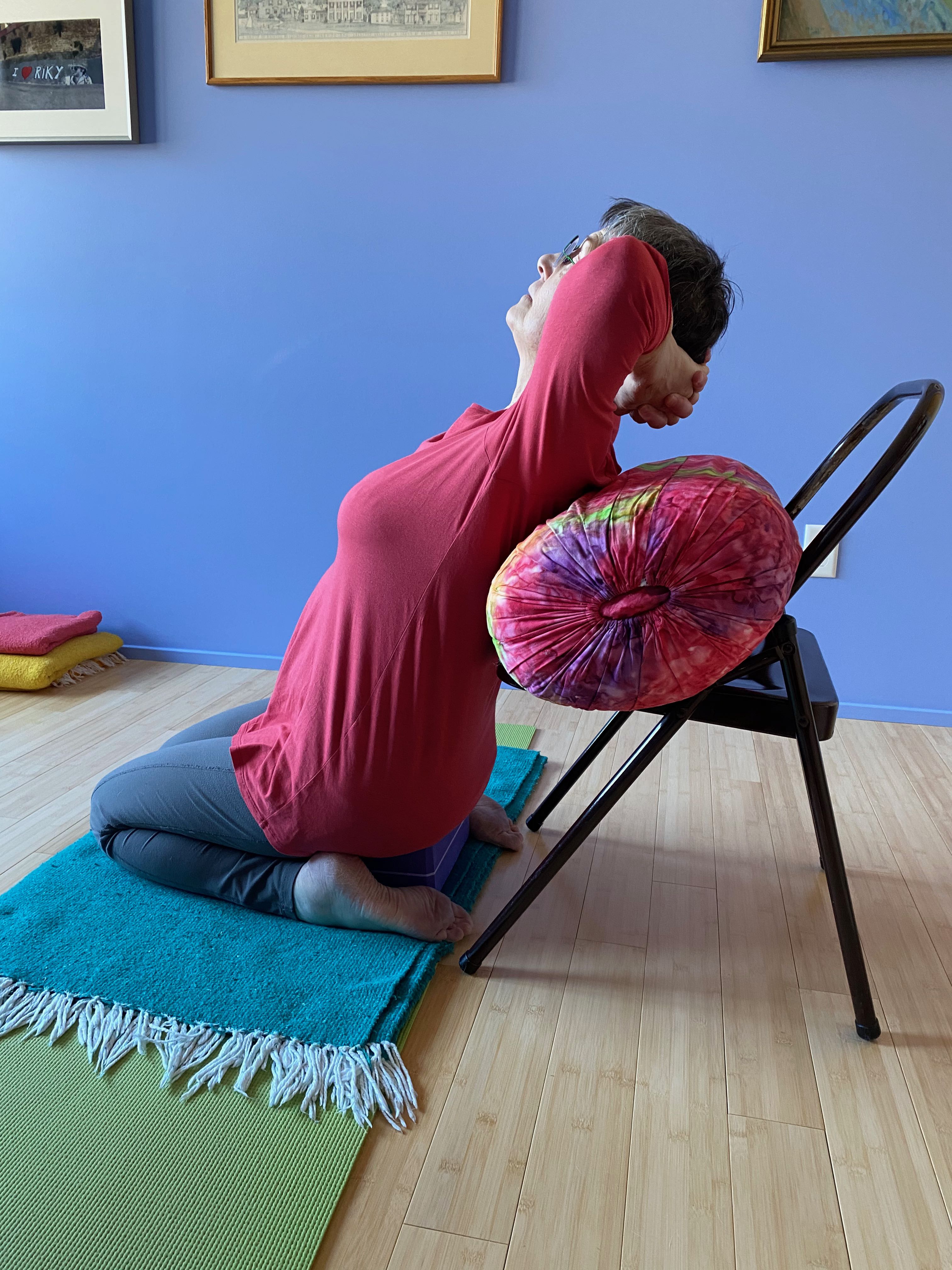 I always thought of it as largely a quad stretch, and yes, the quads are the muscles that are screaming the loudest, at least for me. But it’s a wonderful way to open up the psoas muscles, which run down the inside of your spine from the middle of your back and then connect to your femurs. The diaphragm and the psoas muscles attach in the same place, at the 12th thoracic vertebra, and these muscles interdigitate. I love that word. It means they connect like fingers holding hands. So when you stretch the psoas, you’re also stretching the roots of the diaphragm. Then your upper chest also opens, and your breathing becomes easy and free.
