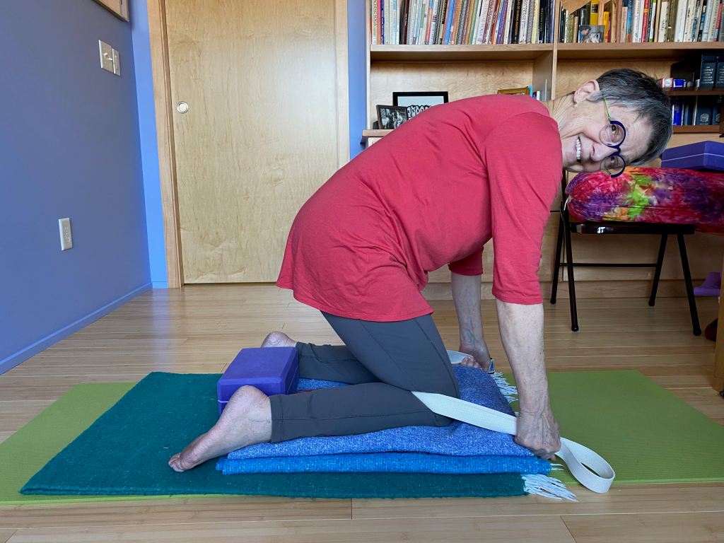 If I’m not properly warmed up, when I get into my final pose, my down-leg knee is often off the floor. I remind myself to relax, don’t freak out about the quad stretch, and after a minute or so my thigh settles down and my knee comes to the floor. It always amazes me! Once it’s on the floor, I really can relax and stay for a while in the pose.