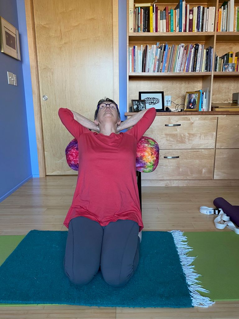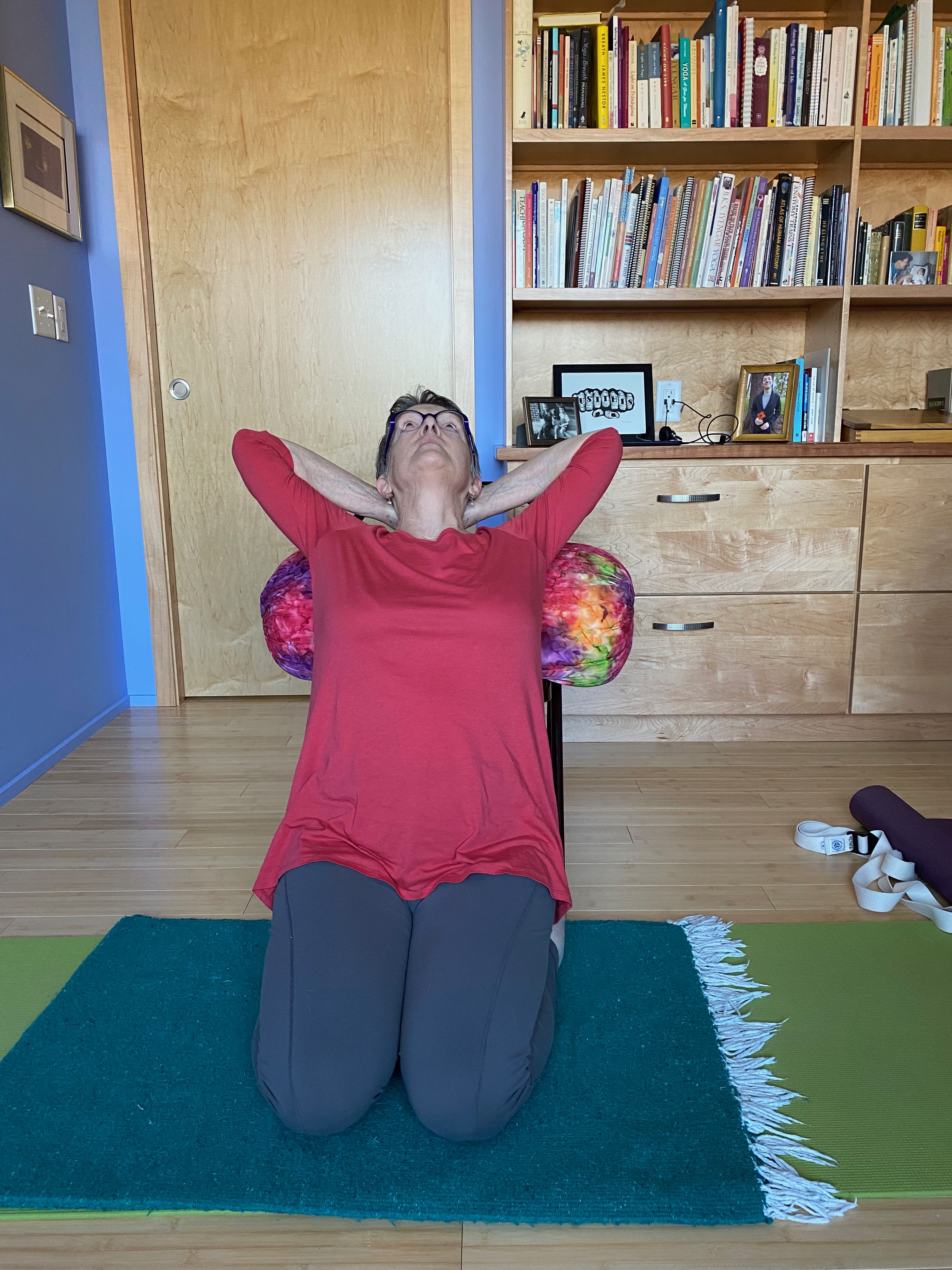 - As you stretch back over your support for Supta Virasana, extend your tailbone down and in, and your upper spine up and back. (We never just lie down in yoga, do we?)